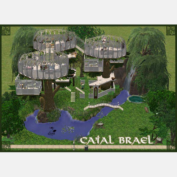 Ca'ial Brael is a family home bounded by river and waterfall and great forest. Elves, being magical, have built stairways both beautiful and magical - allowing great access to this multilevel lot ;) At ground level are the kitchen and dining areas, as well as a spa outdoors next to the waterfall. Ascending the magnificent trees to the top you will find a loungeroom with music area, a double bedroom with ample room for a nursery and another large bedroom housing two single beds and study area for children. The next level down are many smaller rooms - one is a study with pc etc, one is an art room with easel, one is a bathroom/toilet for the children's room, one is a music room with keyboard and the last two are a separate bathroom and toilet for the main bedroom
