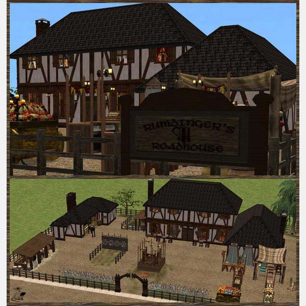 Rumdinger's Roadhouse is a community or business lot built on a Medieval theme. The main building has a restaurant, bar and lounge area downstairs. Upstairs is one double bedroom and a larger bedroom accomodating three guests. A full bathroom and two toilets are also available. Outside there is access to a 4 toilet block. The grounds have an archery target practice run, a stable for sleepy horses, a forge, livestock and stocks for those naughty village idiots. The outdoor market allows your Medieval Simmies to buy groceries and clothing.